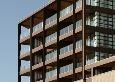 LOCATION: Hobsinville Point, Auckland | ARCHITECT: Cheshire + Architectus | MAIN CONTRACTOR: LT McGuinness | PRODUCTS & WORK CARRIED OUT: Supply, fabricate and install of 3mm Alucolux Solid panel system in rust red, Aliclad aluminium shiplap weatherboard cladding in wood look, cavity fire barrier system for the interstorey and inertenancy and the Aluminium Flashing System in Alucolux Panel. PHOTOGRAPHER: Hamish Melville